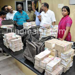 பஸ் மேற்கூரையில் மூடப்பட்டிருந்த தார்பாயை விலக்கி பார்த்தபோது, ஐந்து டிராவல் பேக்குகள் இருந்தன. அவற்றை திறந்து பார்த்தபோது, சங்கீதா அதிர்ச்சியடைந்தார். அவற்றில், கட்டுக்கட்டாக, 500 மற்றும் 1,000 ரூபாய் நோட்டுகள் இருந்தன.உடனடியாக, மாவட்ட தேர்தல் செலவின பார்வையாளர் ராஜகோபால், தேவதாசன் மற்றும் போலீசாருக்கு ஆர்.டி.ஓ., சங்கீதா தகவல் தெரிவித்தார்.