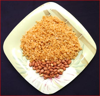 செய்முறை: பச்சரிசியை உப்பு சேர்த்து உதிராக வடித்து வையுங்கள். வேர்க்கடலையை தோல் நீக்குங்கள். வறுக்கக் கொடுத்துள்ள பொருட்களை ஒன்றாக சிவக்க வறுத்து, அத்துடன் வேர்க்கடலையையும் சேர்த்து பொடித்துக்கொள்ளுங்கள். கடுகு, உளுத்தம்பருப்பு, கறிவேப்பிலை தாளித்து சாதத்தில் சேர்த்து, அத்துடன் நெய், வறுத்துப் பொடித்த பொடி சேர்த்து நன்கு கலந்து பரிமாறுங்கள். வேர்க்கடலை மணத்துடனும் வித்தியாசமான சுவையுடனும் அசத்தும் இந்த புதுமையான சாதம்.