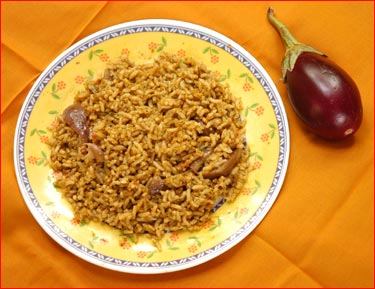 செய்முறை: அரிசியை உப்பு சேர்த்து உதிராக வடித்துக்கொள்ளுங்கள். கத்தரிக்காயை நீளவாக்கில் மெல்லியதாக நறுக்குங்கள். பொடிக்கக் கொடுத்துள்ள பொருட்களை சிவக்க வறுத்து பொடியுங்கள். எண்ணெயைக் காயவைத்து கடுகு, கறிவேப்பிலை தாளித்து, கத்தரிக்காய், மஞ்சள்தூள், சிறிது உப்பு சேர்த்து நன்கு வதக்குங்கள். பொடித்து வைத்திருக்கும் பொடியை அத்துடன் சேர்த்து, கரம் மசாலா, புளி விழுது சேர்த்து நன்கு கிளறி, அத்துடன் சாதம் சேர்த்து நன்கு கலந்து வையுங்கள்.
