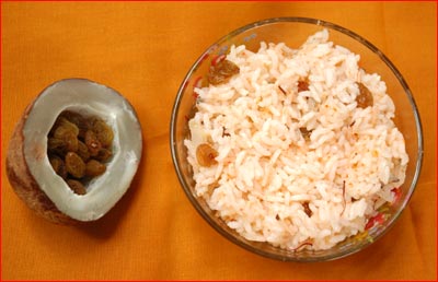 தேவையானவை: பச்சரிசி அல்லது பாசுமதி அரிசி & ஒரு கப், பாசிப்பருப்பு & கால் கப், சர்க்கரை & ஒரு கப், ஏலக்காய்தூள் & அரை டீஸ்பூன், நெய் & 2 டீஸ்பூன், குங்குமப்பூ & சிட்டிகை, கேசரி கலர் & ஒரு சிட்டிகை. தாளிக்க: பல்லுபல்லாக நறுக்கிய தேங்காய் & 2 டேபிள்ஸ்பூன், நறுக்கிய முந்திரிப்பருப்பு & ஒரு டேபிள்ஸ்பூன், திராட்சை & 8, நெய் & 2 டேபிள்ஸ்பூன். செய்முறை: அரிசி, பருப்பை தனித்தனியே உதிராக வேகவைத்துக்கொள்ளுங்கள். சர்க்கரையுடன் கால் கப் தண்ணீர் சேர்த்து அடுப்பில் வையுங்கள். அது கொதித்து, சற்று கெட்டியானதும் சாதம், பருப்பு, நெய், ஏலக்காய்தூள், கேசரி கலர், குங்குமப்பூ சேர்த்து கிளறி இறக்குங்கள். நெய்யில், முந்திரி, தேங்காய், திராட்சை வறுத்து சேர்த்துக் கிளறிப் பரிமாறுங்கள். விருந்துகளுக்கும் பண்டிகைகளுக்கும் ஏற்ற சாதம் இது.