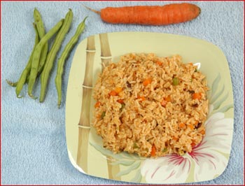 தேவையானவை: பாசுமதி அரிசி & ஒரு கப், காய்கறிகள் (பீன்ஸ், கேரட், பட்டாணி) & அரை கப், டொமேட்டோ சாஸ் & ஒரு டேபிள்ஸ்பூன், சில்லி சாஸ் & ஒரு டேபிள்ஸ்பூன், இஞ்சி&பூண்டு விழுது & ஒரு டீஸ்பூன், பெரிய வெங்காயம் & 1, மிளகாய்தூள் & அரை டீஸ்பூன், உப்பு & தேவையான அளவு, எண்ணெய் & 2 டேபிள்ஸ்பூன்.
