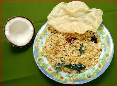 அரிசியை உப்பு சேர்த்து உதிராக வடித்துக்கொள்ளுங்கள். அப்பளத்தைப் பொரித்துக்கொள்ளுங்கள். தேங்காய் எண்ணெயைக் காயவைத்து, தாளிக்கும் பொருட்களைச் சேர்த்து சற்றுப் பொன்னிறமாகப் பொரிந்ததும், பொரித்த அப்பளம், வறுத்த தேங்காய் துருவல், கறிவேப்பிலை, சிறிது உப்பு சேர்த்து நன்கு கிளறுங்கள். அப்பளச் சுவையும் தேங்காய் எண்ணெய் மணமும் சேர்ந்து, வித்தியாசமான சுவை கொடுக்கும்.