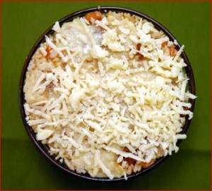 செய்முறை: அரிசியை உப்பு சேர்த்து உதிராக வடித்துக்கொள்ளுங்கள். காய்கறிகளை உப்பு சேர்த்து வேகவைத்துக் கொள்ளுங்கள். பூண்டு, வெங்காயத்தை தோலுரித்து பொடியாக நறுக்குங்கள். எண்ணெயைக் காயவைத்து, முதலில் பூண்டு சேர்த்து வதக்கி, பிறகு வெங்காயம், சிறிது உப்பு சேருங்கள். வெங்காயம் நன்கு வதங்கியதும், தக்காளி சாறு, மிளகாய்தூள், சீரகத்தூள், காய் சேர்த்து, பச்சை வாசனை போக கொதித்ததும் ஒரு டேபிள்ஸ்பூன் சீஸ் துருவல், சாதம் சேர்த்து நன்கு கிளறி ஒரு கண்ணாடி கிண்ணத்தில் போட்டு சற்று அழுத்திவிட்டு அதன் மேல் மீதமுள்ள சீஸ்துருவலை பரவினாற் போல தூவி ‘பேக்’ செய்யுங்கள். ஓவன் வசதி இல்லாதவர்கள் ஒரு கடாயில் பாதியளவு மணல் பரப்பி அதன் மீது இந்த சாதம் இருக்கும் பாத்திரத்தை வைத்து முப்பது நிமிடங்கள் கழித்து எடுக்கலாம்.
