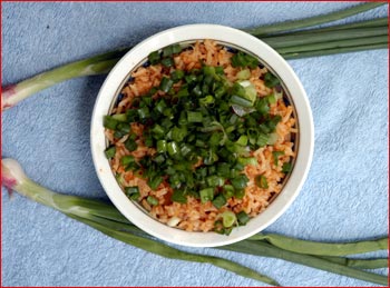 செய்முறை: அரிசியை உப்பு சேர்த்து உதிராக வடித்துக்கொள்ளுங்கள். வெங்காய தாளில் உள்ள வெங்காயத்தை தனியே எடுத்து பொடியாக நறுக்குங்கள். தாளையும் பொடியாக நறுக்குங்கள். மிளகாயை கொதிக்கும் நீரில் 10 நிமிடம் ஊற வைத்து, உரித்த பூண்டுடன் சேர்த்து நைஸாக அரைத்தெடுங்கள். எண்ணெயைக் காயவைத்து அரைத்த விழுது சேர்த்து வதக்கி, பிறகு வெங்காயம் சேர்த்து மேலும் 5 நிமிடம் வதக்குங்கள். பின்னர் சாதம், சாஸ்கள், உப்பு, வெங்காய தாள் சேர்த்து நன்கு கிளறி பரிமாறுங்கள்.