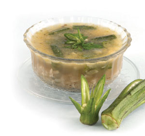 செய்முறை: கடாயில் எண்ணெயை விட்டு, சூடானதும் நறுக்கிய வெண்டைக்காயை போட்டு பச்சை வாசனை போகும் வரை வதக்கவும். இதில் பொடியாக நறுக்கிய பூண்டை போட்டு நன்கு வதக்கி, தண்ணீர் ஊற்றி, சாதம், உப்பு சேர்த்து கொதிக்கவிடவும். நன்கு கொதித்தவுடன் சோயா சாஸ், வெள்ளை மிளகுத்தூள்சேர்த்து, மேலும் சிறிது நேரம் கொதிக்க வைத்து, இறக்கி பரிமாறவும்.