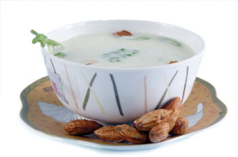 தேவையானவை: பாதாம் – 50 கிராம், வெங்காயம் – ஒன்று, செலரி, பாஸில் இலை – சிறிதளவு, காய்கறி வேகவைத்த தண்ணீர் – அரை லிட்டர், பால் – ஒரு கப், பாதாம் – சிறிதளவு, மிளகுத்தூள், உப்பு – தேவையான அளவு.