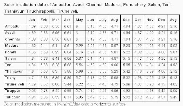 இந்த பட்டியலின் படி திருச்சியில் சராசரியாக நாள் ஒன்றுக்கு 5.13KWh வீதம் ஒரு வருடத்தில் 1872.45 KWh / யூனிட் மின்சாரத்தை ஒரு சதுர மீட்டர் பரப்பில் பெற முடியும். 1KWh என்பது 1000Wh அல்லது 1 யூனிட் ஆகும்.