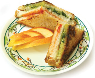 செய்முறை: பிரெட்டின் இருபக்கமும் நன்கு பரவலாக வெண்ணெய் தடவவும். ஒரு பக்கம் புதினா சட்னி தடவி, இன்னொரு பிரெட் ஸ்லைஸால் மூடி, அந்த பிரெட் ஸ்லைஸின் மேல் வெண்ணெய் தடவி அதன் மறுபக்கத்தில் டொமெட்டோ சாஸ் தடவி இன்னொரு பிரெட் ஸ்லைஸால் மூடி விரும்பிய வடிவத்தில் கட் செய்து பரிமாறவும்.