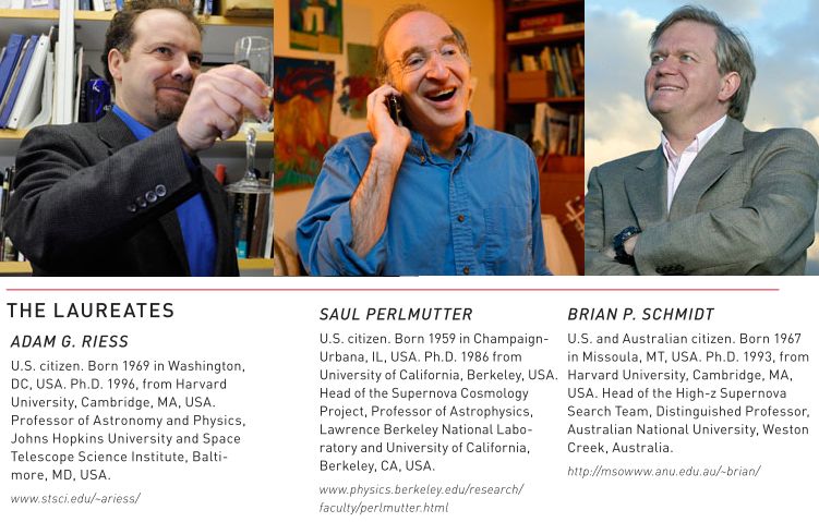 ‘பிரபஞ்சத்தின் அதிவேக விரிவை’க் கண்டுபிடித்த சால் பெர்ல்மட்டர், பிரையன் ஷ்மிட் மற்றும் ஆடம் ரீஸ் என்ற மூவருக்கு இந்த ஆண்டின் இயற்பியலுக்கான நோபல் பரிசு வழங்கப்பட்டுள்ளது! மூவரும் அமெரிக்கர்கள் என்றாலும் ஆடம் ரீஸ் மட்டும் அமெரிக்க ஆஸ்திரேலியர்.