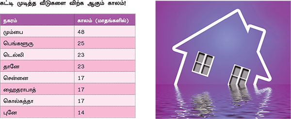 நாடு முழுக்க கட்டிமுடிக்கப்பட்ட அடுக்குமாடிக் குடியிருப்புகள் அதிக எண்ணிக்கையில் முடங்கிக்கிடக்கின்றன. மும்பையில் கட்டிமுடிக்கப்பட்ட அடுக்குமாடிக் குடியிருப்பு வீடு ஒன்று விற்பதற்கு குறைந்தது 48 மாதங்கள் ஆகிறது. இது பெங்களூருவில் 25 மாதங்களாகவும், டெல்லியில் 23 மாதங்களாகவும், சென்னையில் இது 17 மாதங்களாகவும் இருக்கிறது. கட்டி முடிக்கப்பட்ட வீடு விற்க 15 மாதங்கள் எடுத்துக்கொள்வது வழக்கமாக இருக்கிறது. அந்தவகையில் சென்னை பரவாயில்லை என்றுதான் சொல்லவேண்டும். ஆனால், கட்டிமுடிக்கப்பட்டு விற்காமல் இருக்கும் அடுக்குமாடிக் குடியிருப்புகளின் எண்ணிக்கை சென்னையில் மட்டும் 45,000 ஆக இருக்கிறது என்கிறது ரியல் எஸ்டேட் அமைப்பான கிரடாய். கோவையில் 4,500 குடியிருப்பு கள் விற்கப்படாமல் இருப்பதாகவும் தெரிகிறது.