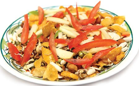 செய்முறை: உருளைக்கிழங்கை வேகவைத்து தோலுரித்து பொடியாக நறுக்கவும். ஆப்பிளை பொடியாக நறுக்கி, எலுமிச்சைச் சாறு விட்டு கலக்கி வைக்கவும். வெங்காயம், தக்காளியை மிகவும் பொடியாக நறுக்கவும். அகலமான பேஸினில் வேர்க்கடலை, முளைகட்டிய பயறு, தக்காளி, மாதுளை, பொரி, மாங்காய், உருளைக்கிழங்கு, வெங்காயம், ஆப்பிள் துண்டுகள், கார்ன் ஃப்ளேக்ஸ், உப்பு சேர்த்து நன்கு குலுக்கிக் கலக்கவும். பரிமாறும் முன் இந்தக் கலவையை தட்டில் போட்டு தேவையான இனிப்பு சட்னி விட்டுக் கலந்து, கரம் மசாலாத்தூள், மல்லித்தழை தூவி பரிமாறவும்.