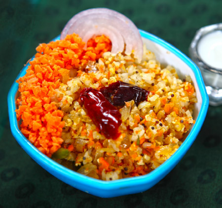 செய்முறை: அரிசியை ஒரு மணி நேரம் ஊறவைத்து, தேங்காய்த் துருவல், காய்ந்த மிளகாய், சிறிது உப்பு சேர்த்துக் கரகரப்பாக அரைக்க வேண்டும். தயிரில் சிறிது உப்பு சேர்த்து, நீர் விட்டு தோசைமாவு போல் கரைக்க வேண்டும். வாணலியில் சிறிது எண்ணெய் விட்டு, சூடானதும் தாளிக்கும் பொருட்கள் போட்டுத் தாளித்து, கறிவேப்பிலை, வெங்காயம் வதக்கி, காய்கறி, பட்டாணி போட்டு, அரைத்த மாவு, மசாலா சேர்த்து, மிதமான அனலில் கைவிடாமல் கிளறவும். வெந்ததும் இறக்கி, சூடாகப் பரிமாறலாம்.